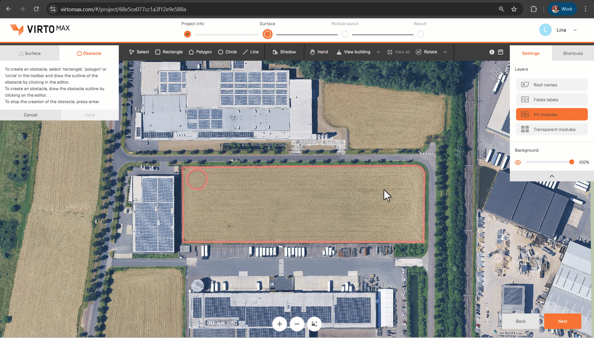 To initiate your ground-mount project, begin by accurately defining the site’s surface area once your project specifications are set. Select the Surface tool, then choose either the rectangle or polygon option to outline the perimeter where you intend to position PV rack structures.