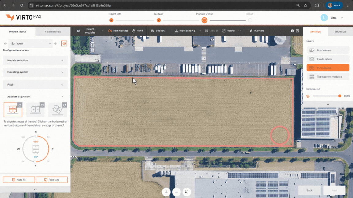 In the Azimuth alignment section, you will find three alignment options for your layout. The first option aligns the longest side of the module with a border of your defined surface; after selecting this, choose which border to align to directly on the drawing. The second option functions similarly, but aligns the shortest side of the module to your selected border. The third option enables manual orientation—use the compass tool below to set a precise azimuth angle for your layout.
